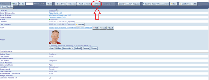 Print badges using the Print button in Record Manager or from single record view. This method is fine for smaller jobs (1-10) but will not be efficient for large prints. NOTE: If you are encoding a card you still must use the VPQM