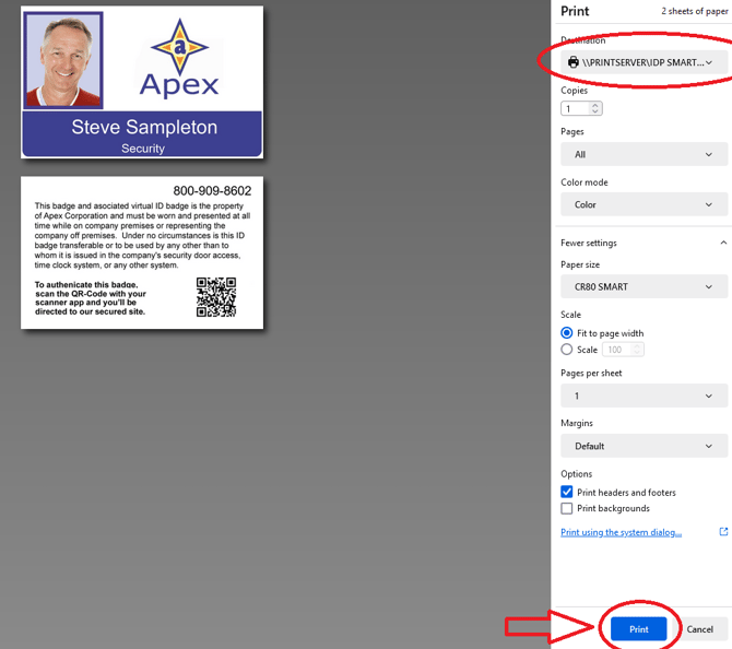 - Badge printer settings can be adjusted at this time using the "Print using the system dialogue" hyperlink near the bottom of the menu.
